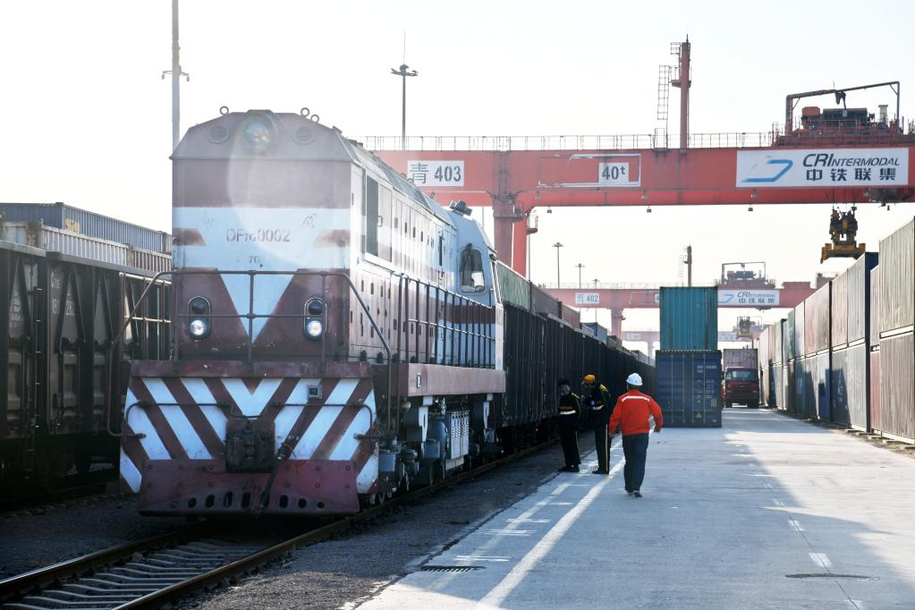 A freight train bound for Kazakhstan leaves the multimodal transport center in the China-Shanghai Cooperation Organization (SCO) local economic and trade cooperation demonstration zone in Qingdao, east China's Shandong Province, Nov. 9, 2020. (Xinhua/Li Ziheng)