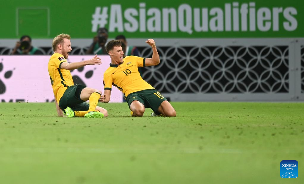 Ajdin Hrustic (R) of Australia celebrates scoring during the World Cup Qatar 2022 Asian Qualifying playoff game between Australia and the United Arabic Emirates (UAE) at Ahmad Bin Ali Stadium in Doha, capital of Qatar, June 7, 2022. (Photo by Nikku/Xinhua)