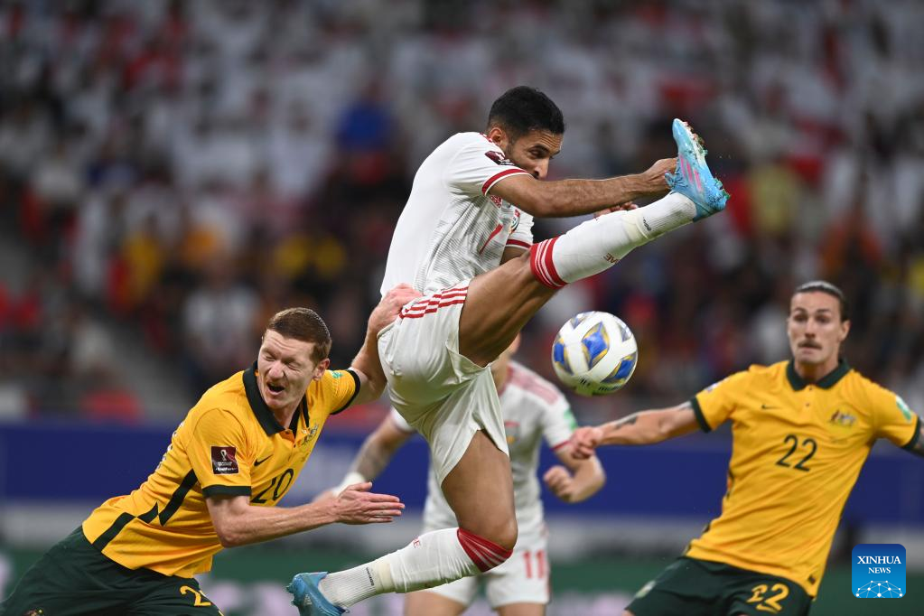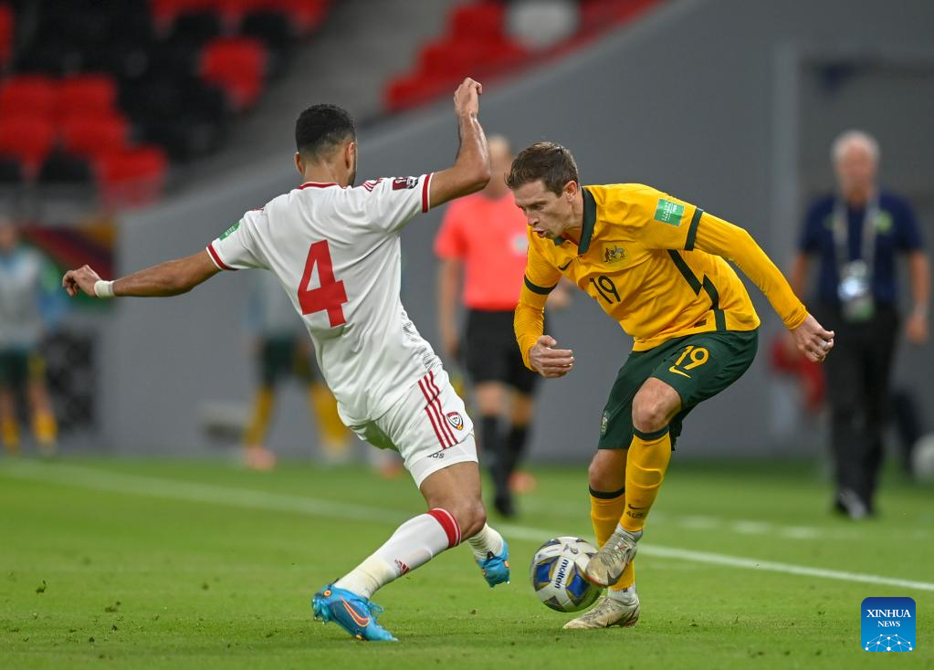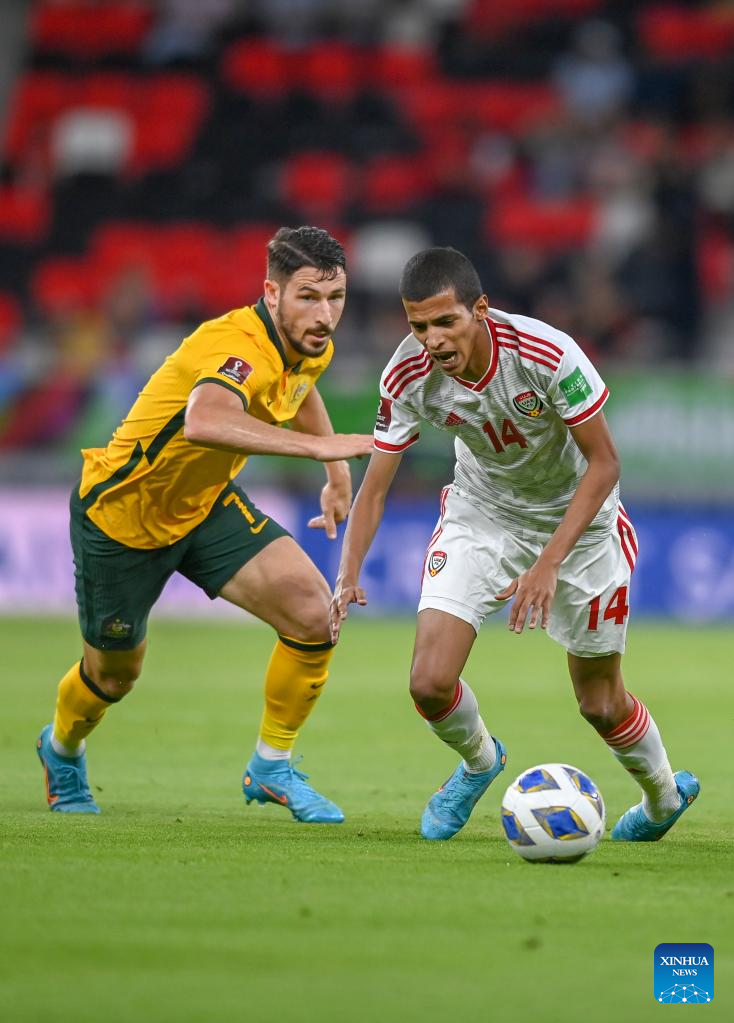 UAE's Khaled Ebraheim Helalc Ebraheim Aldhanhani (L) competes against Craig Goodwin of Australia during the World Cup Qatar 2022 Asian Qualifying playoff game between Australia and the United Arabic Emirates (UAE) at Ahmad Bin Ali Stadium in Doha, capital of Qatar, June 7, 2022. (Photo by Nikku/Xinhua)