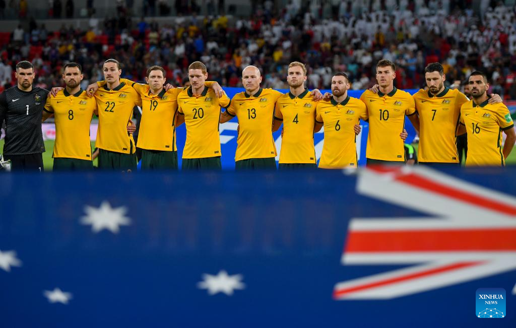 Players of Australia stand for their national anthem prior to the World Cup Qatar 2022 Asian Qualifying playoff game between Australia and the United Arabic Emirates (UAE) at Ahmad Bin Ali Stadium in Doha, capital of Qatar, June 7, 2022. (Photo by Nikku/Xinhua)