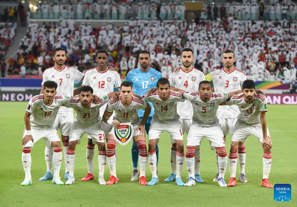 Players of UAE pose for group photos prior to the World Cup Qatar 2022 Asian Qualifying playoff game between Australia and the United Arabic Emirates (UAE) at Ahmad Bin Ali Stadium in Doha, capital of Qatar, June 7, 2022. (Photo by Nikku/Xinhua)