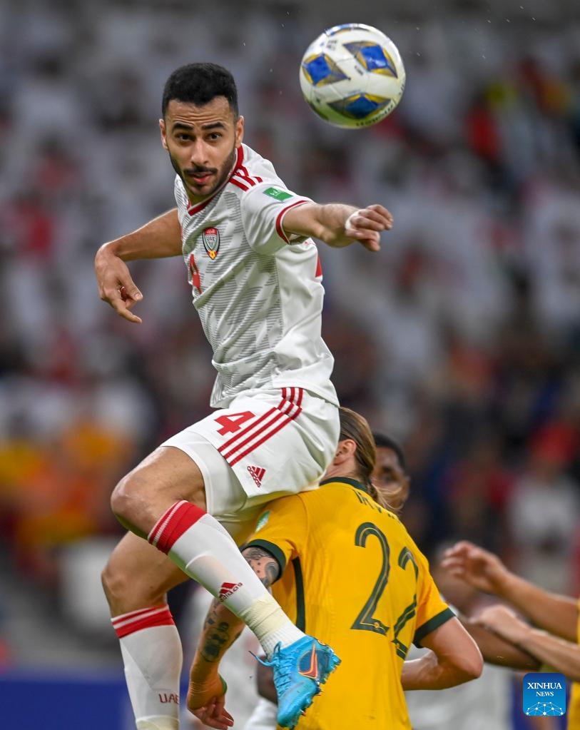 UAE's Khaled Ebraheim Helalc Ebraheim Aldhanhani (top) competes during the World Cup Qatar 2022 Asian Qualifying playoff game between Australia and the United Arabic Emirates (UAE) at Ahmad Bin Ali Stadium in Doha, capital of Qatar, June 7, 2022. (Photo by Nikku/Xinhua)