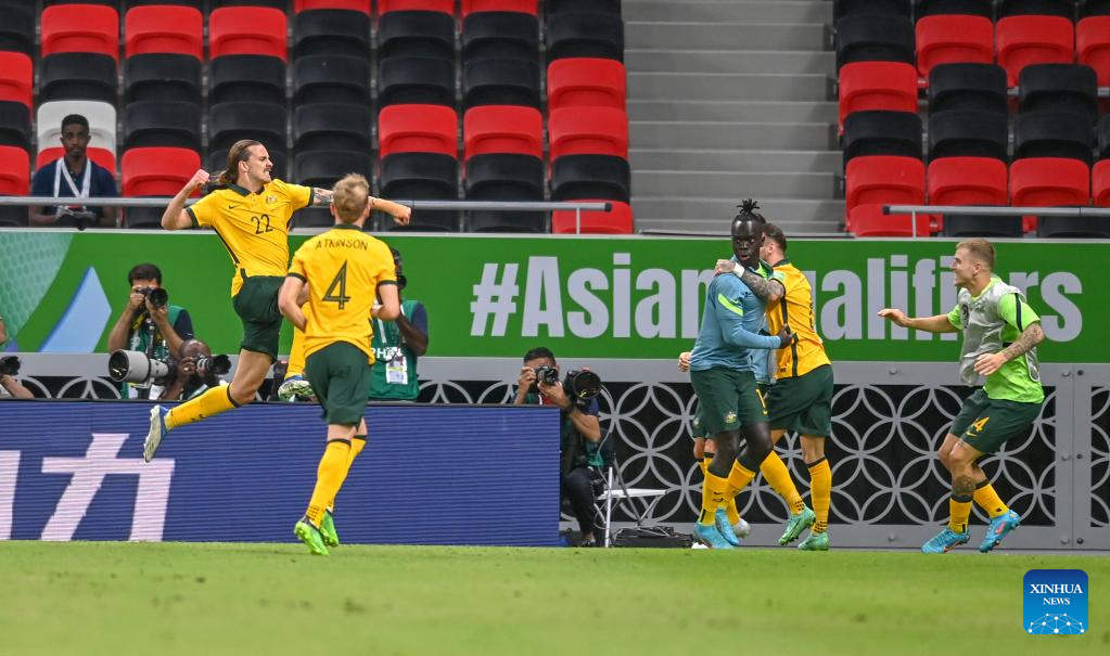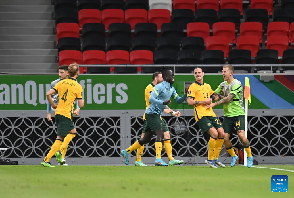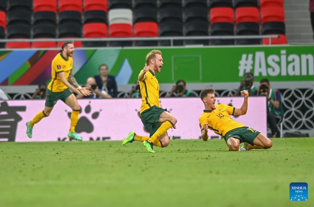 Jackson Irvine (2nd R) of Australia celebrates scoring during the World Cup Qatar 2022 Asian Qualifying playoff game between Australia and the United Arabic Emirates (UAE) at Ahmad Bin Ali Stadium in Doha, capital of Qatar, June 7, 2022. (Photo by Nikku/Xinhua)