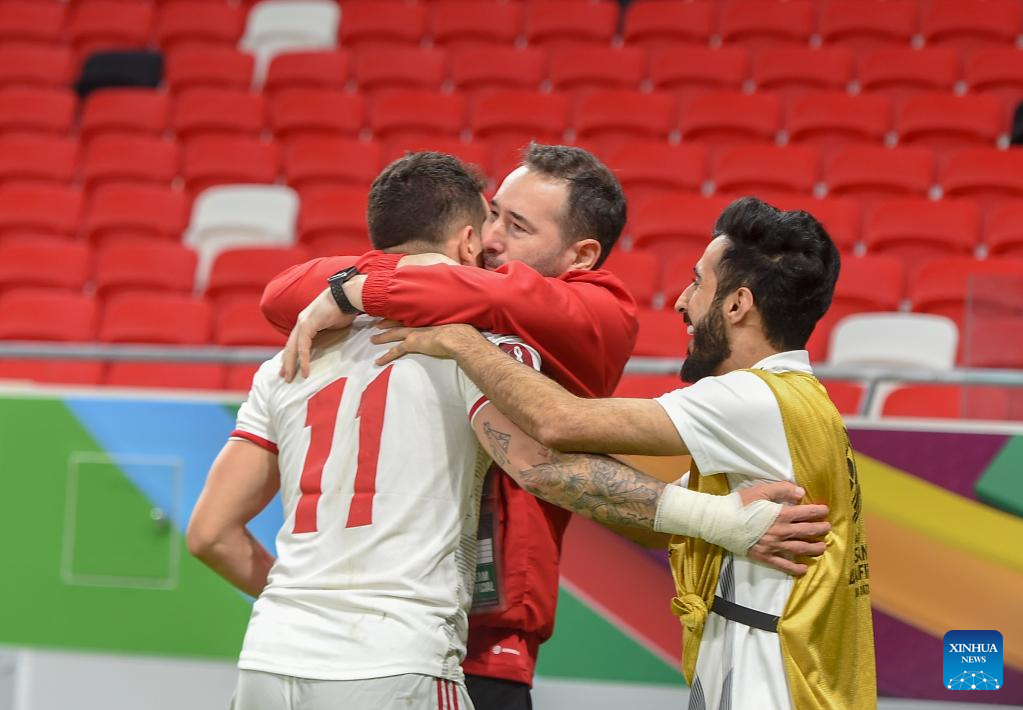 UAE's Caio Canedo (L) celebrates a goal during the World Cup Qatar 2022 Asian Qualifying playoff game between Australia and the United Arabic Emirates (UAE) at Ahmad Bin Ali Stadium in Doha, capital of Qatar, June 7, 2022. (Photo by Nikku/Xinhua)