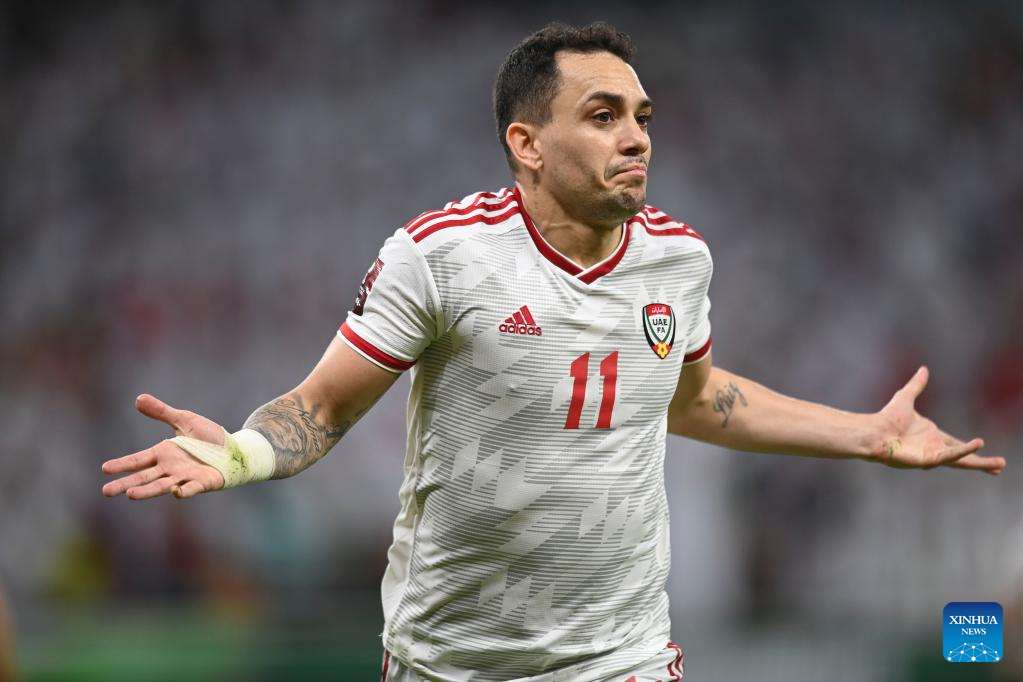 UAE's Caio Canedo celebrates a goal during the World Cup Qatar 2022 Asian Qualifying playoff game between Australia and the United Arabic Emirates (UAE) at Ahmad Bin Ali Stadium in Doha, capital of Qatar, June 7, 2022. (Photo by Nikku/Xinhua)