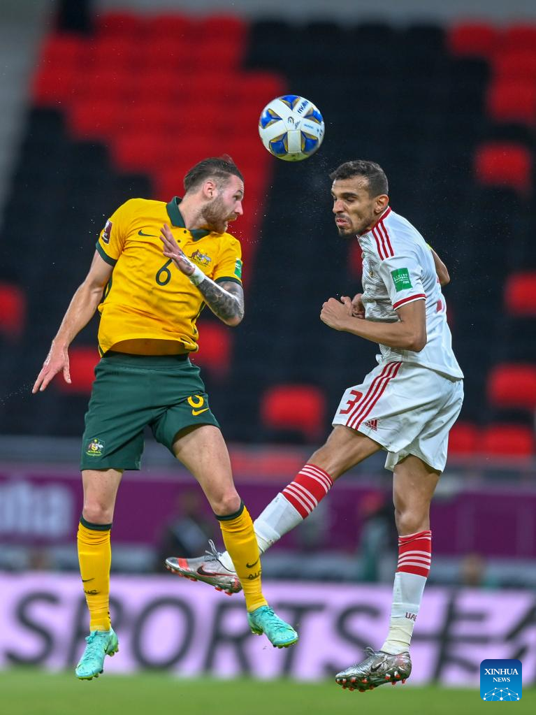 UAE's Walid Abbas (R) competes against Martin Boyle of Australia during the World Cup Qatar 2022 Asian Qualifying playoff game between Australia and the United Arabic Emirates (UAE) at Ahmad Bin Ali Stadium in Doha, capital of Qatar, June 7, 2022. (Photo by Nikku/Xinhua)