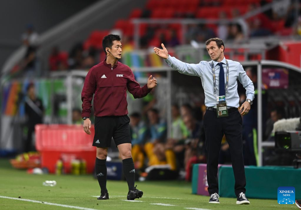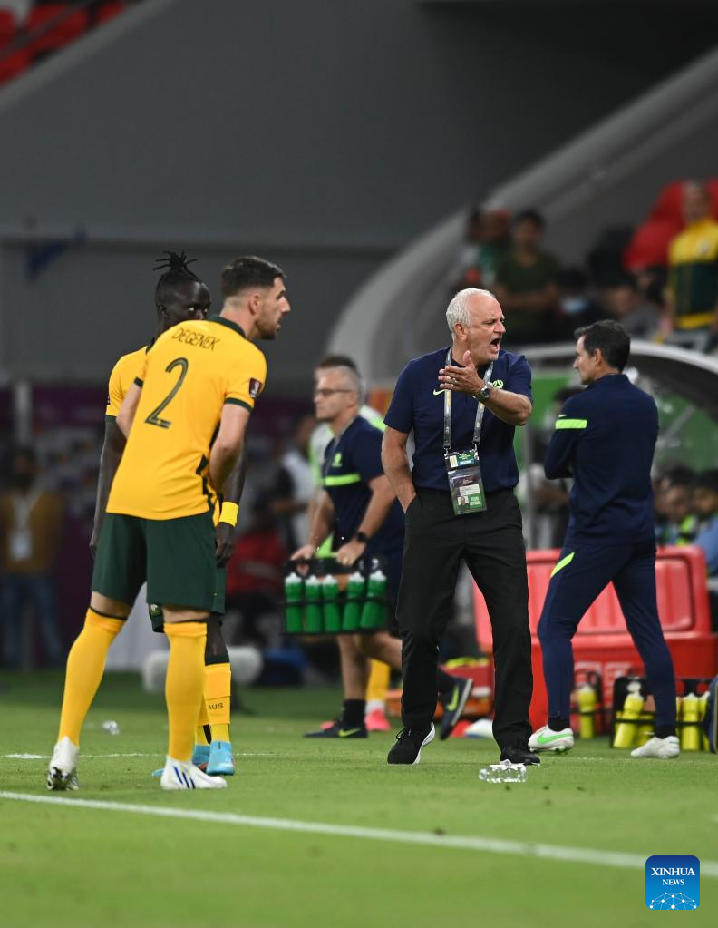 Australia's head coach Graham Arnold (2nd R) reacts during the World Cup Qatar 2022 Asian Qualifying playoff game between Australia and the United Arabic Emirates (UAE) at Ahmad Bin Ali Stadium in Doha, capital of Qatar, June 7, 2022. (Photo by Nikku/Xinhua)