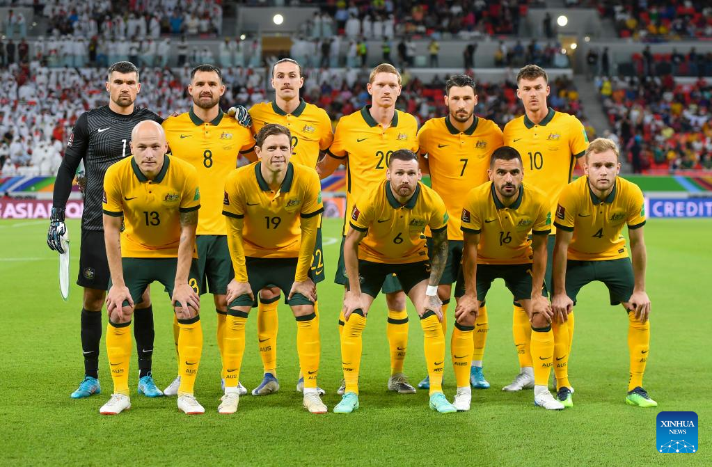 Players of Australia pose for group photos prior to the World Cup Qatar 2022 Asian Qualifying playoff game between Australia and the United Arabic Emirates (UAE) at Ahmad Bin Ali Stadium in Doha, capital of Qatar, June 7, 2022. (Photo by Nikku/Xinhua)