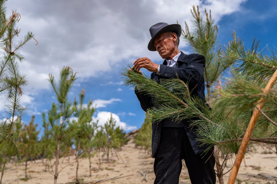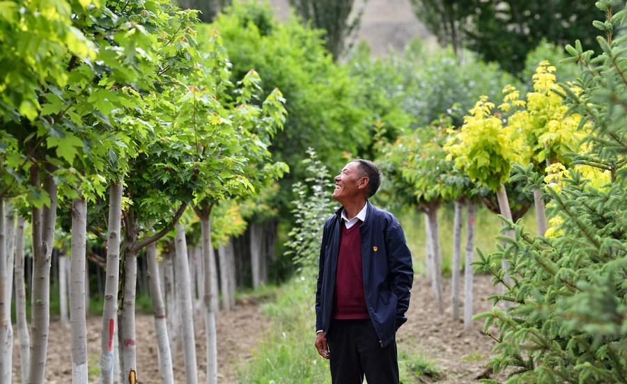 File photo taken on July 20, 2021 shows Penjig checking saplings at his nursery in Zhanang County, Shannan City of southwest China's Tibet Autonomous Region. (Xinhua/Jigme Dorje)