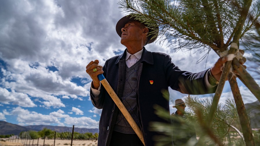 Penjig checks the growth of saplings at the afforestation area by the Yarlung Zangbo River in Zhanang County, Shannan City of southwest China's Tibet Autonomous Region, May 26, 2022.(Xinhua/Sun Fei)