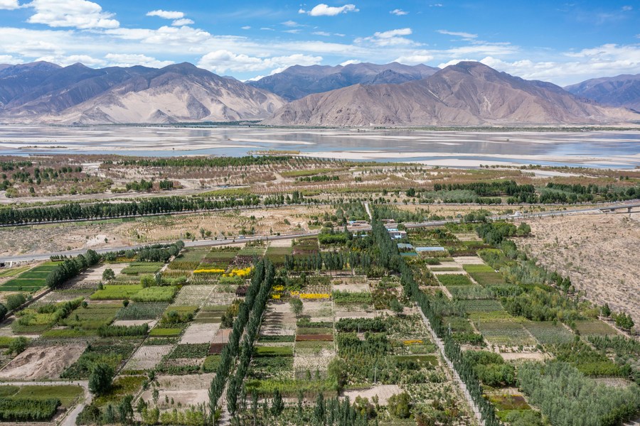 Aerial photo taken on May 27, 2022 shows the nursery run by Penjig in Zhanang County, Shannan City of southwest China's Tibet Autonomous Region. (Xinhua/Sun Fei)