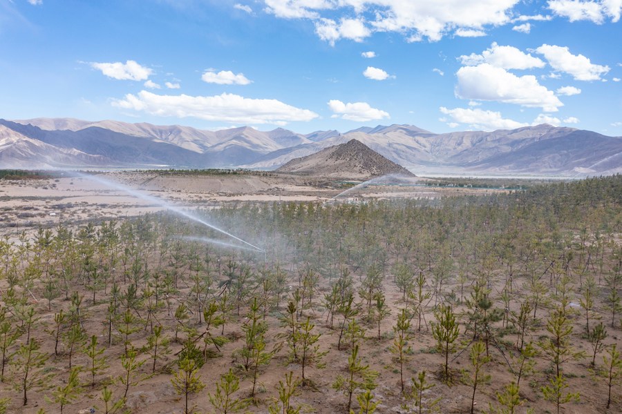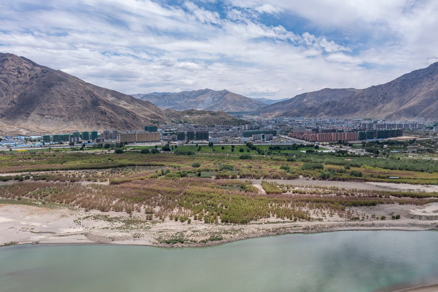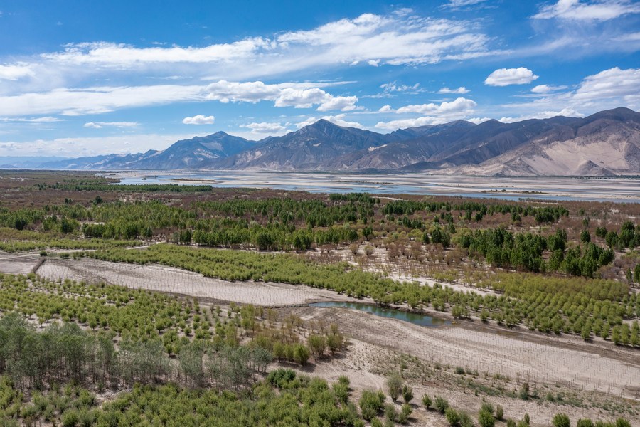 LHASA, June 8 (Xinhua) -- The middle reaches of the Yarlung Zangbo River, once stretched of barren land with sandstorms raging in spring and winter, now see a sea of green trees all over the place.