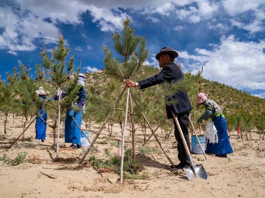 Penjig (front) instructs workers in planting trees at the afforestation area by the Yarlung Zangbo River in Zhanang County, Shannan City of southwest China's Tibet Autonomous Region, May 26, 2022. (Xinhua/Sun Fei)