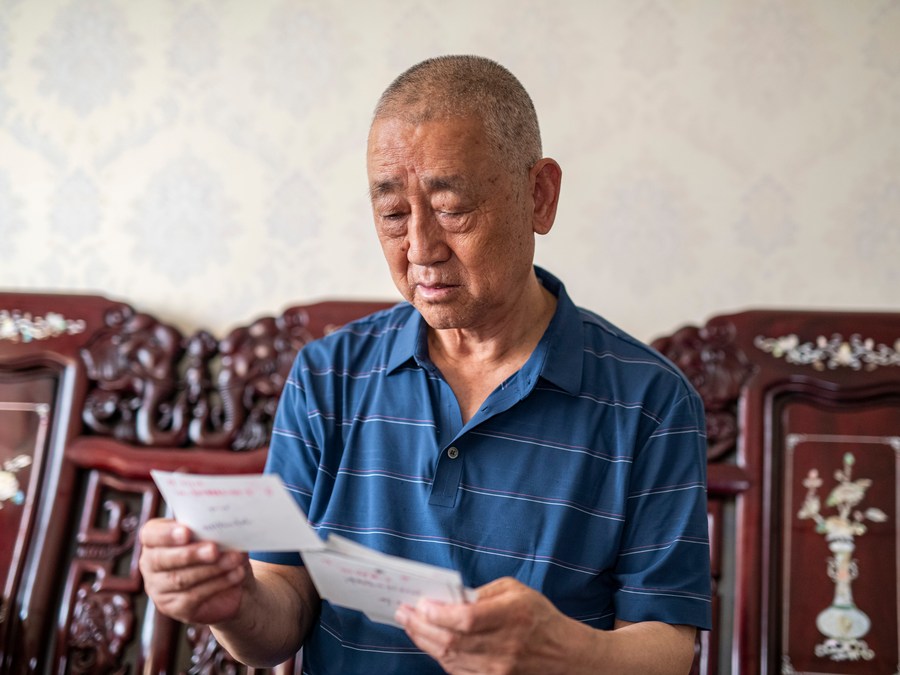 Retired Li Chunlu views old photos at home in Chengdu City, southwest China's Sichuan Province, June 3, 2022. (Xinhua/Tang Wenhao)