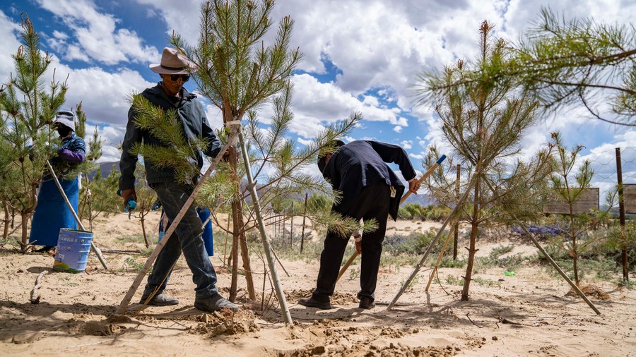 Penjig (R) plants trees with his old partner Toinzhub Cering (C) at the afforestation area by the Yarlung Zangbo River in Zhanang County, Shannan City of southwest China's Tibet Autonomous Region, May 26, 2022. (Xinhua/Sun Fei)
