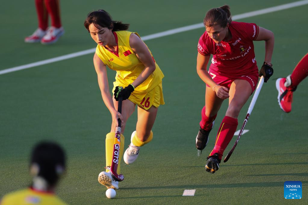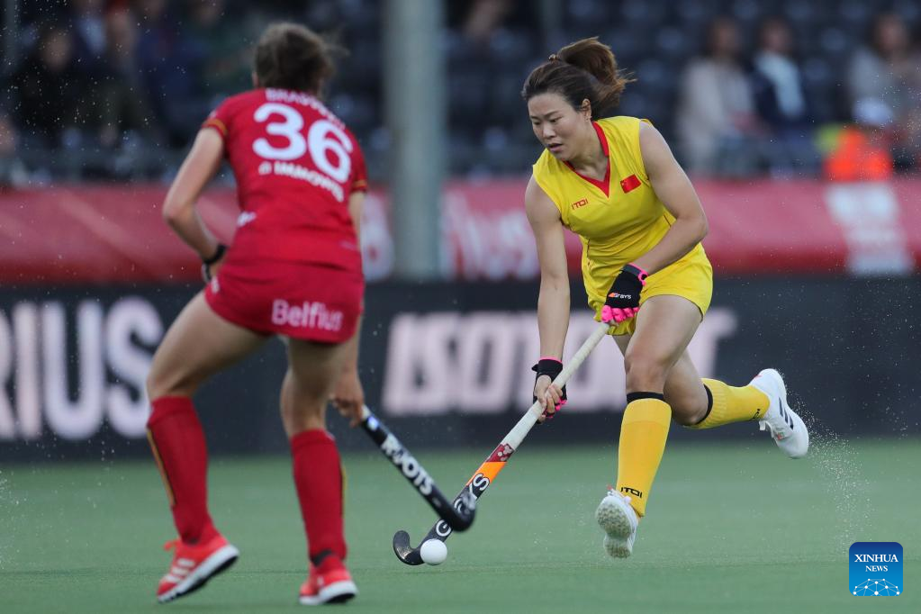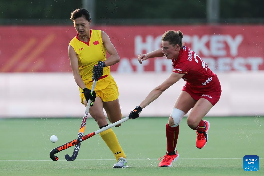 Ou Zixia (L) of China competes during the FIH Hockey Pro League match between Belgium and China in Antwerp, Belgium, June 7, 2022. Belgium women's hockey team beat Chinese women's hockey team by 3-1. (Xinhua/Zheng Huansong)