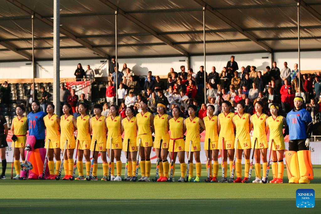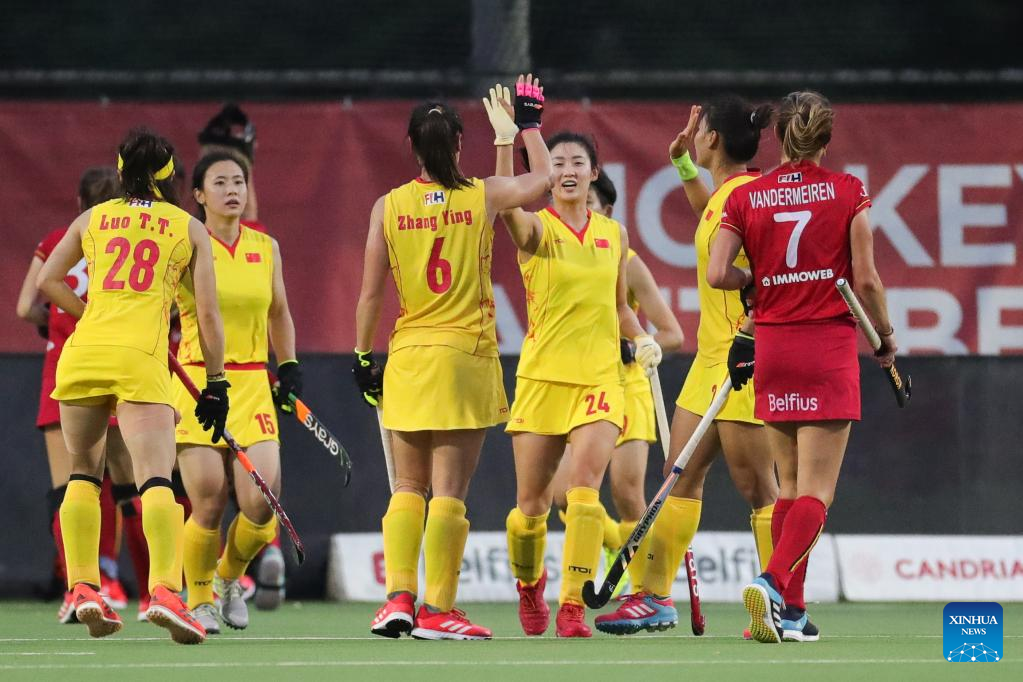 Players of China gather before the FIH Hockey Pro League match between Belgium and China in Antwerp, Belgium, June 7, 2022. Belgium women's hockey team beat Chinese women's hockey team by 3-1. (Xinhua/Zheng Huansong)