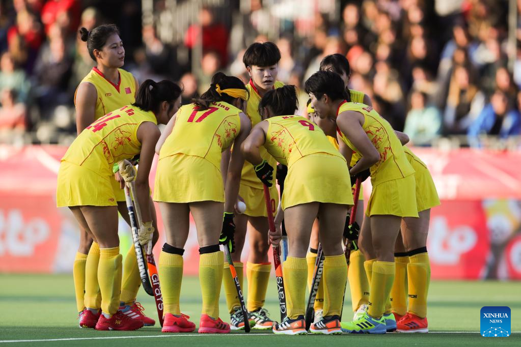Players of China gather during the FIH Hockey Pro League match between Belgium and China in Antwerp, Belgium, June 7, 2022. Belgium women's hockey team beat Chinese women's hockey team by 3-1. (Xinhua/Zheng Huansong)
