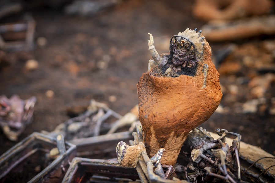 Burnt mold casings are chipped away to reveal a fine metal craft in Lalitpur, Nepal, June 8, 2022. (Photo by Hari Maharjan/Xinhua) ■