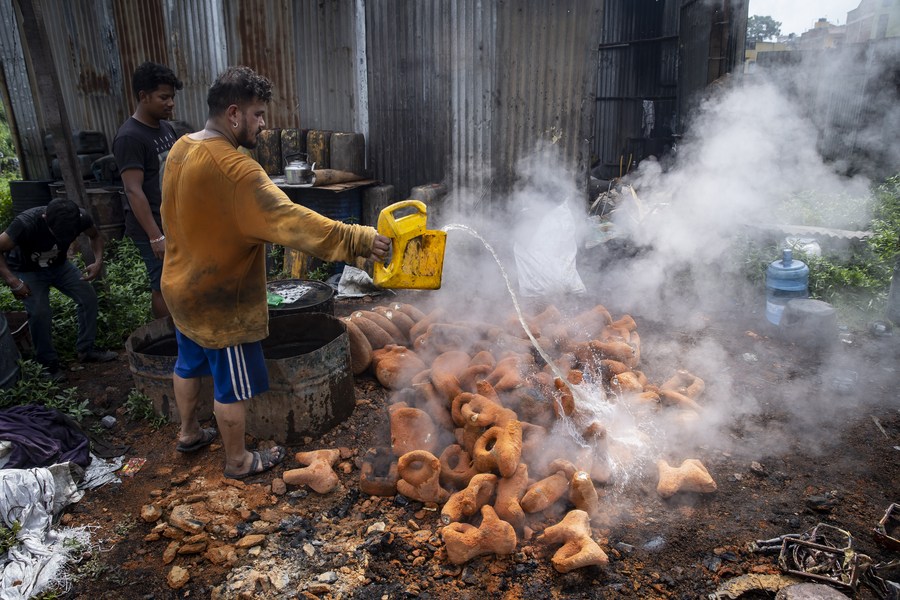 A worker pours water to drench the molds for metal casting in Lalitpur, Nepal, June 8, 2022. (Photo by Hari Maharjan/Xinhua)