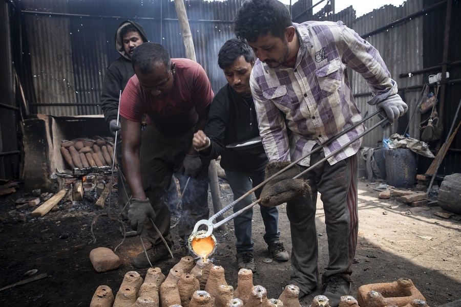 A worker puts copper wire and copper pieces into a hot pot and stirs them to be melted for metal casting in a workplace in Lalitpur, Nepal, June 8, 2022. (Photo by Hari Maharjan/Xinhua)