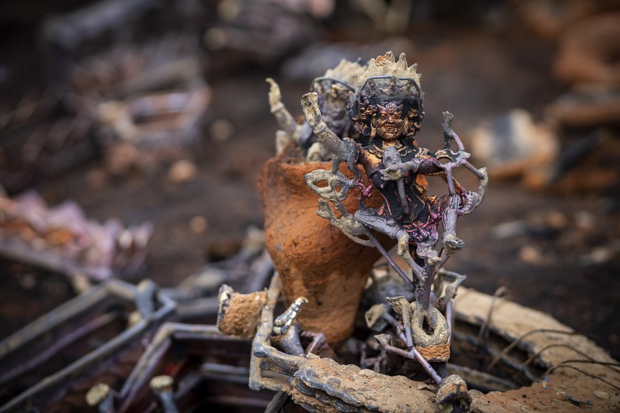 Burnt mold casings are chipped away to reveal a fine metal craft in Lalitpur, Nepal, June 8, 2022. (Photo by Hari Maharjan/Xinhua)