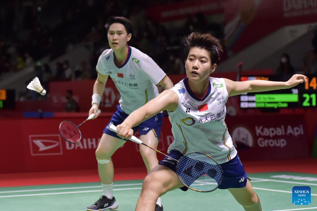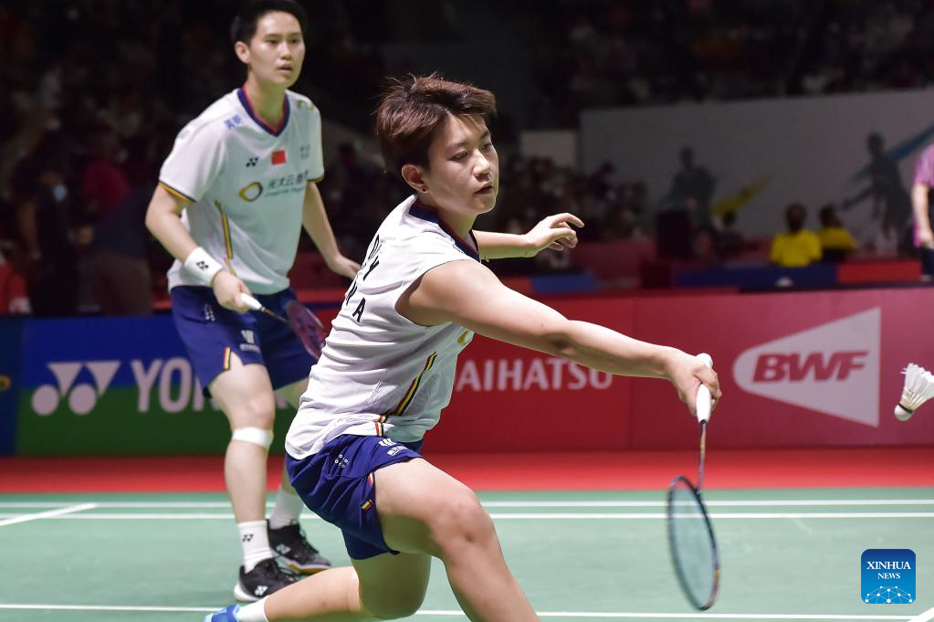 Du Yue (R)/Li Wenmei of China compete during the women's doubles round of 16 match against Lee So Hee/Shin Seung Chan of South Korea at Daihatsu Indonesia Masters 2022 at the Istora Senayan sports stadium in Jakarta, Indonesia, on June 9, 2022. (Xinhua/Veri Sanovri)