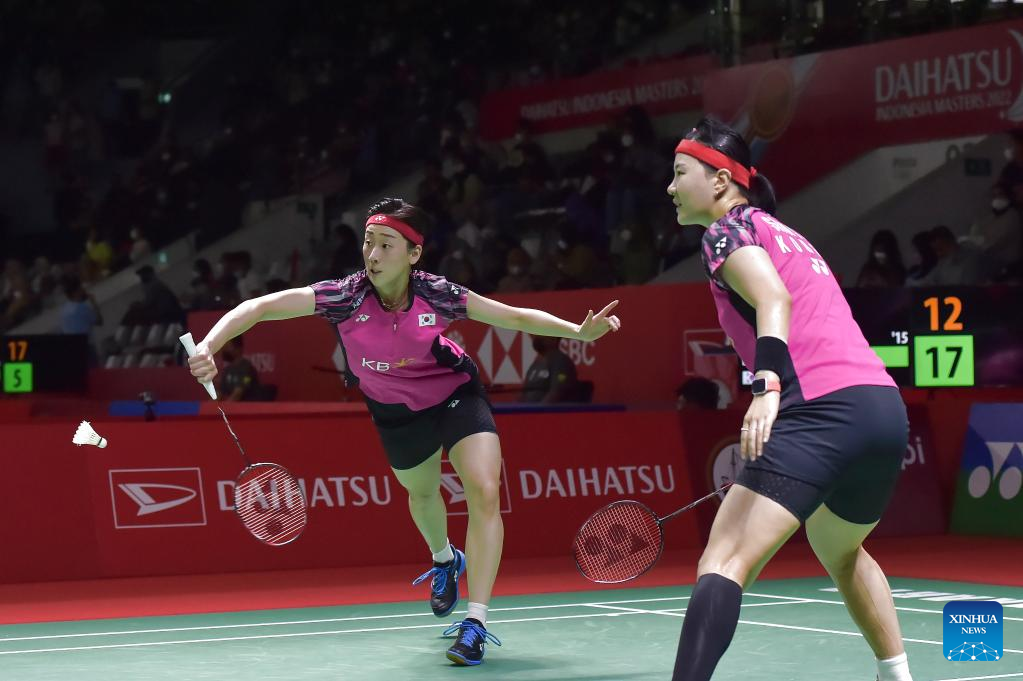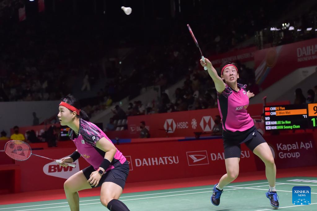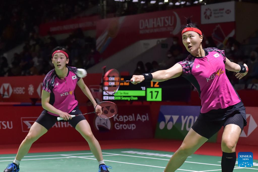 Lee So Hee/Shin Seung Chan(R) of South Korea compete during the women's doubles round of 16 match against Du Yue/Li Wenmei of China at Daihatsu Indonesia Masters 2022 at the Istora Senayan sports stadium in Jakarta, Indonesia, on June 9, 2022. (Xinhua/Veri Sanovri)
