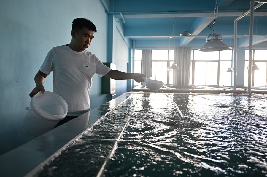 Zeng Guangneng, a fish farmer, feeds fish fry in a breeding demonstration building of Fengjiawan Modern Fishery Industrial Park in Wenchang, south China's Hainan Province, June 1, 2022.(Xinhua/Guo Cheng)