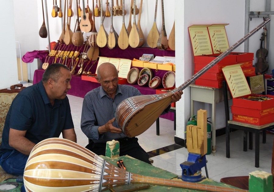 Craftsmen discuss the making of an instrument at a traditional musical instrument atelier in village of Towanki-ogusak in Kashgar Prefecture, northwest China's Xinjiang Uygur Autonomous Region, May 28, 2022. (Xinhua/Du Gang)
