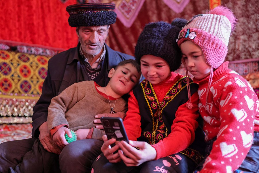 Children watch videos on a mobile phone with a family member in Rasekam Village of Taxkorgan Tajik Autonomous County, northwest China's Xinjiang Uygur Autonomous Region, Feb. 24, 2022. (Xinhua/Ding Lei)