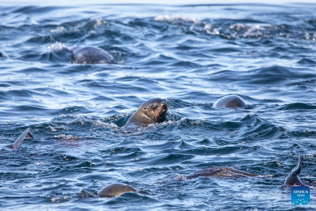 Cape fur seals swim in the sea near Simon's Town in Cape Town, South Africa, on June 9, 2022. (Xinhua/Lyu Tianran)