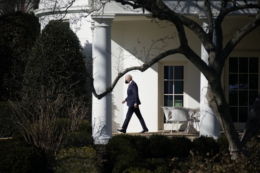 U.S. President Joe Biden leaves the White House in Washington, D.C., the United States, Feb. 10, 2022. (Photo by Ting Shen/Xinhua)