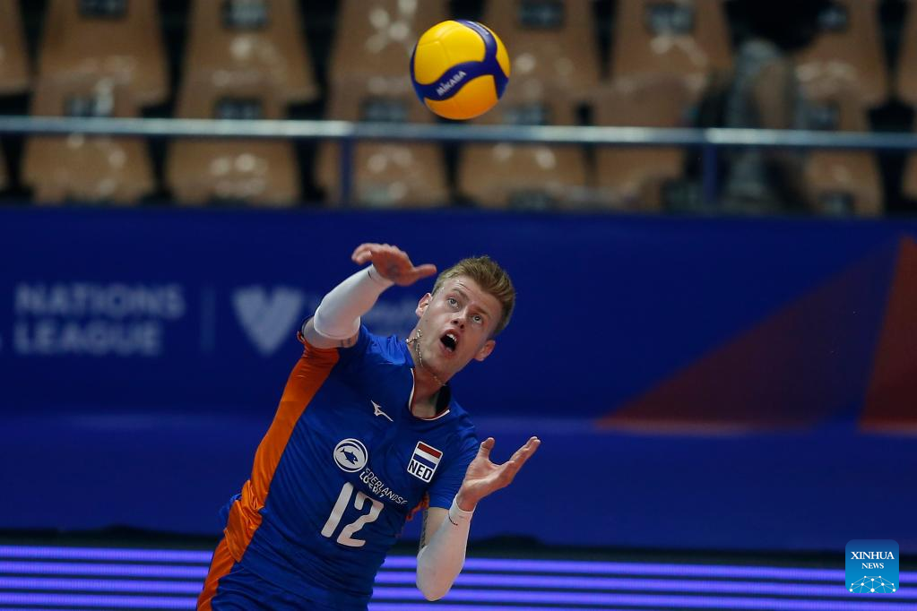 Bennie Junior Tuinstra of the Netherlands serves the ball during the FIVB Volleyball Nations League Men's Pool 1 match between the Netherlands and Iran in Brasilia, Brazil, June 10, 2022. (Photo by Lucio Tavora/Xinhua)