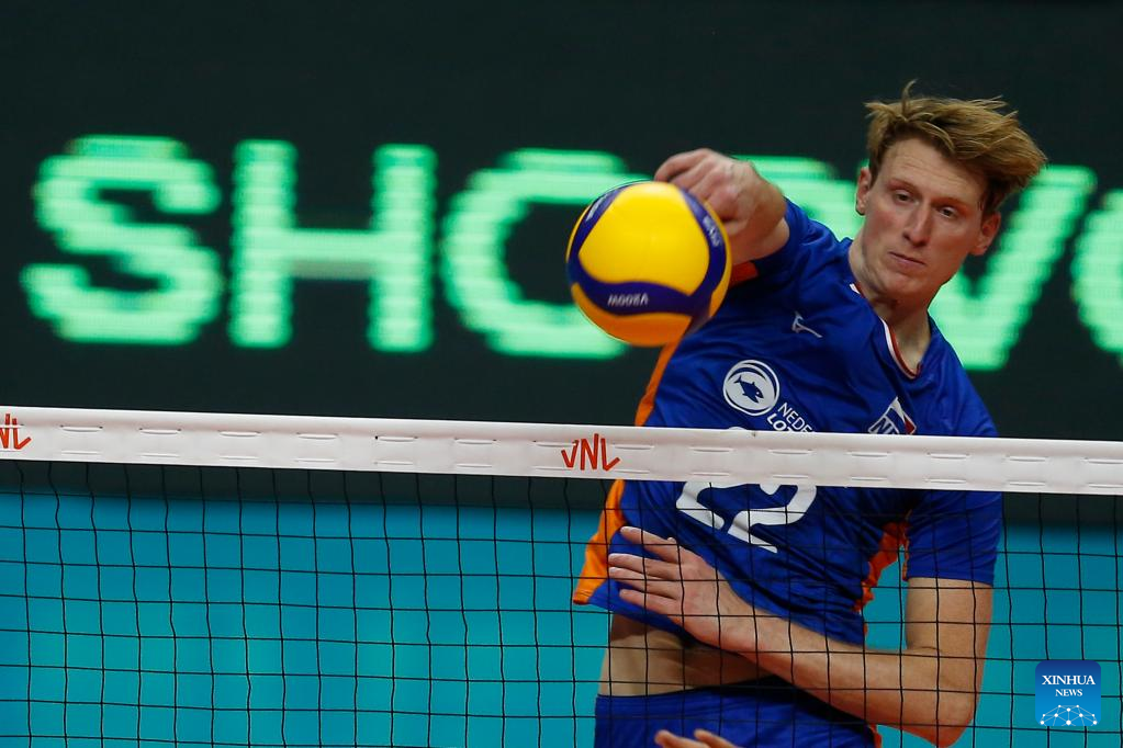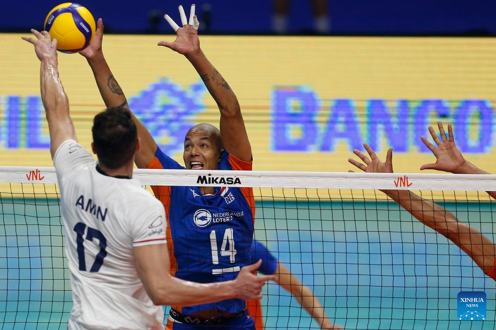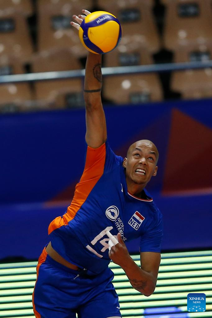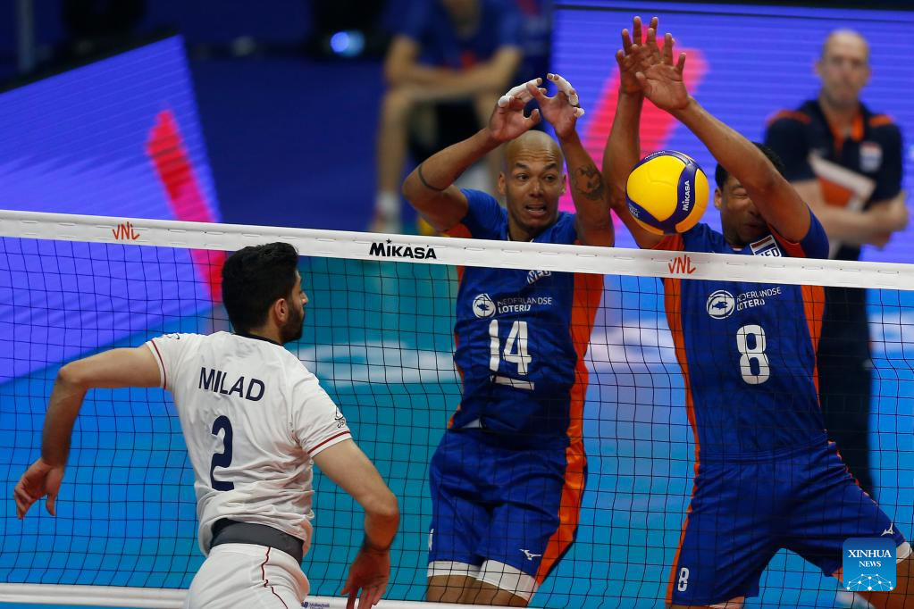 Bennie Junior Tuinstra (R) spikes the ball during the FIVB Volleyball Nations League Men's Pool 1 match between the Netherlands and Iran in Brasilia, Brazil, June 10, 2022. (Photo by Lucio Tavora/Xinhua)