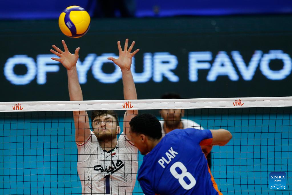 Iran's Milad Ebadipour Ghara.H (R) spikes the ball during the FIVB Volleyball Nations League Men's Pool 1 match between the Netherlands and Iran in Brasilia, Brazil, June 10, 2022. (Photo by Lucio Tavora/Xinhua)