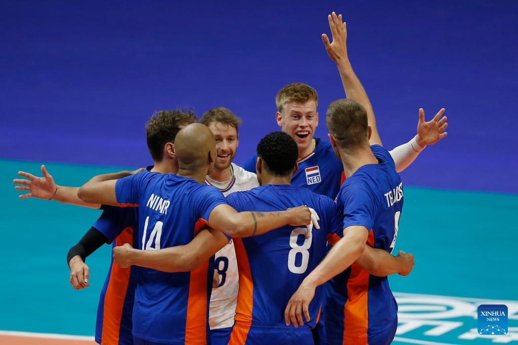 Players of the Netherlands celebrate during the FIVB Volleyball Nations League Men's Pool 1 match between the Netherlands and Iran in Brasilia, Brazil, June 10, 2022. (Photo by Lucio Tavora/Xinhua)