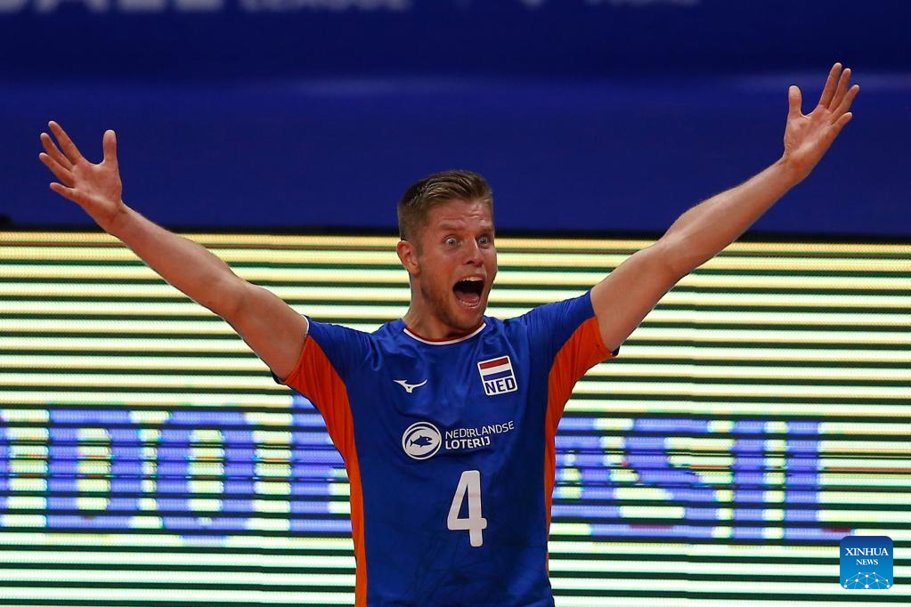 Thijs Ter Horst of the Netherlands celebrates during the FIVB Volleyball Nations League Men's Pool 1 match between the Netherlands and Iran in Brasilia, Brazil, June 10, 2022. (Photo by Lucio Tavora/Xinhua)