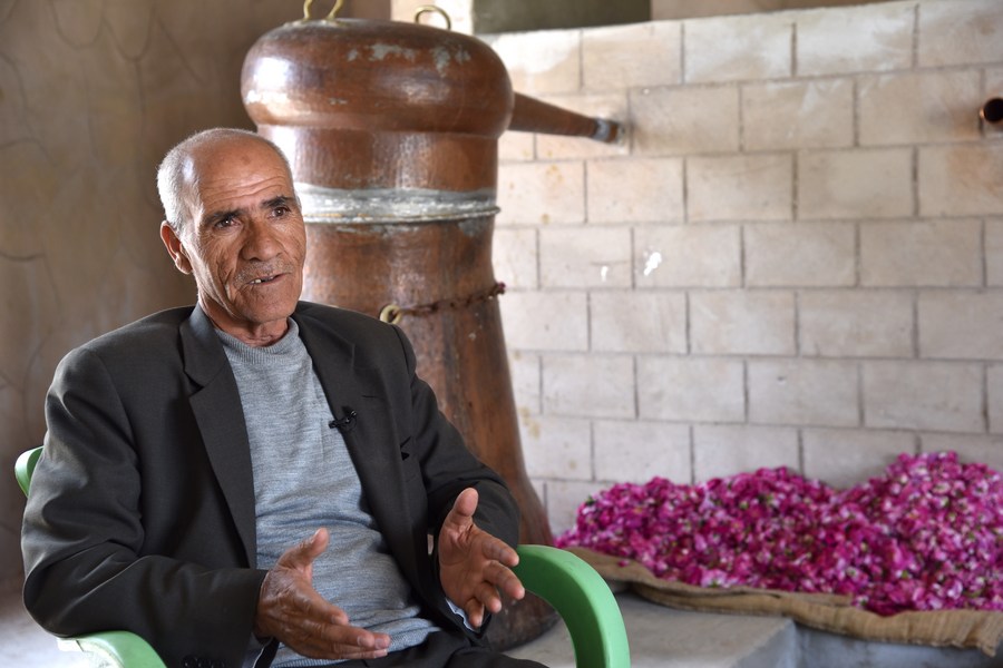 Muhammad Jamal Abbas, a 60-year-old Damascene Rose farmer, speaks during an interview with Xinhua at the al-Marah town north of the capital Damascus on May 28, 2022. (Photo by Ammar Safarjalani/Xinhua)