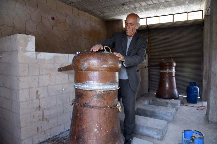 Muhammad Jamal Abbas, a Damascene Rose farmer, operates an old machine to extract rose oil at the al-Marah town north of the capital Damascus on May 28, 2022. (Photo by Ammar Safarjalani/Xinhua)