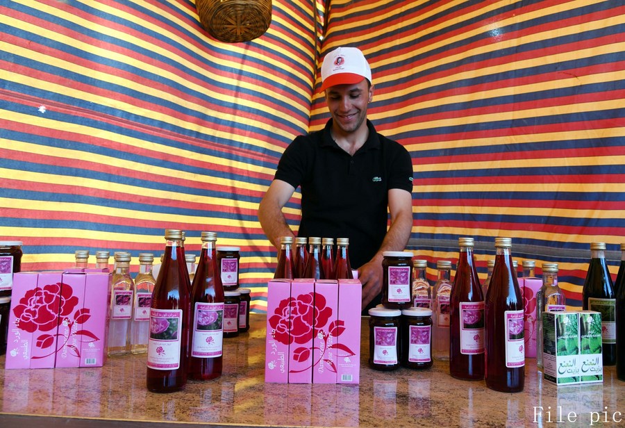 A man arranges bottles of rose water during celebrations of the harvest of the famous Damascene rose in the town of al-Marah, north of Damascus, Syria, on June 20, 2019. (Xinhua/Ammar Safarjalani)