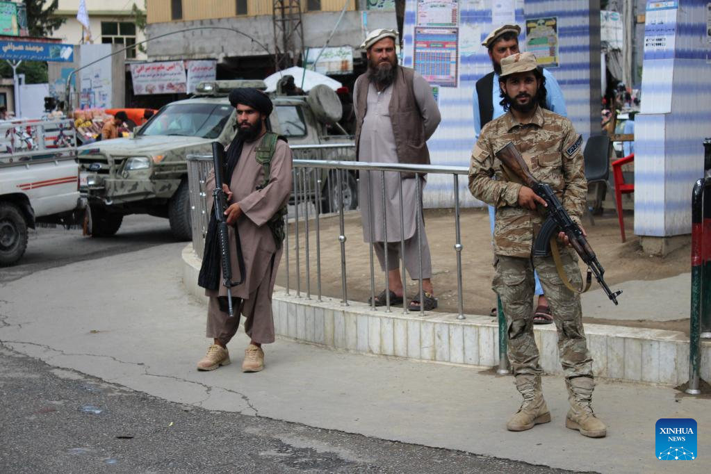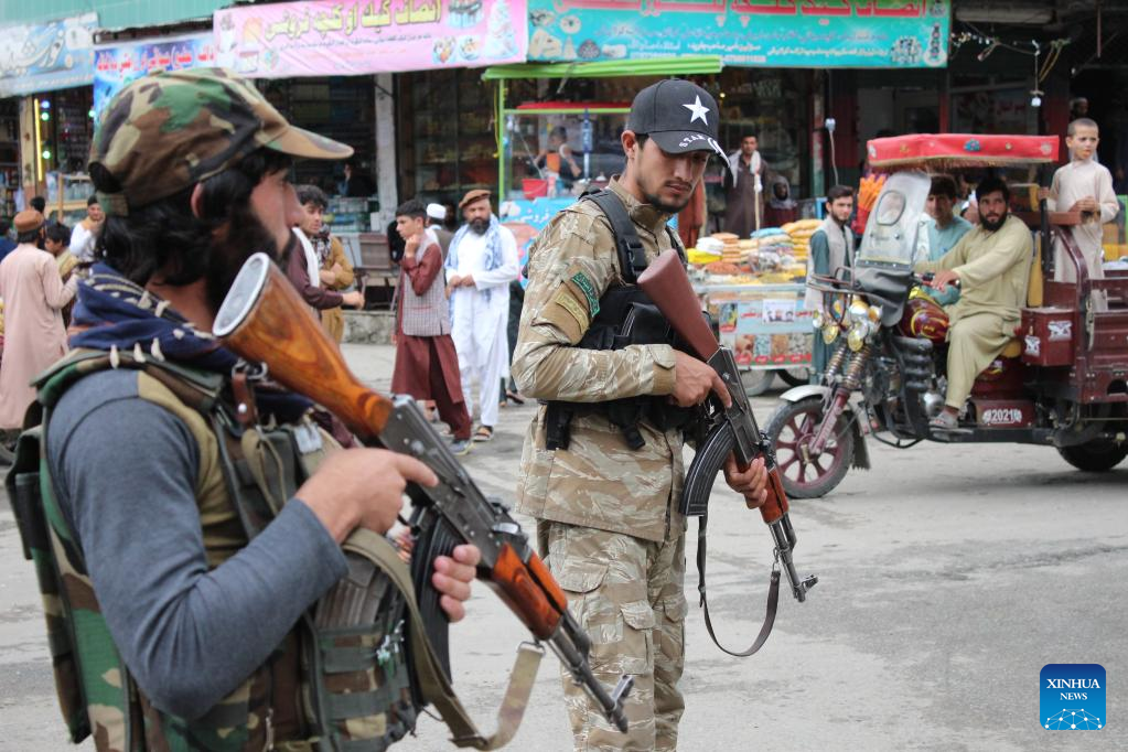 Afghan security force members stand guard near the site of a blast in Kunar province, Afghanistan, June 12, 2022. Five persons were injured as a roadside bomb struck a vehicle of security personnel in Afghanistan's eastern Kunar province on Sunday, police said. (Photo by Qazafi Mal/Xinhua)