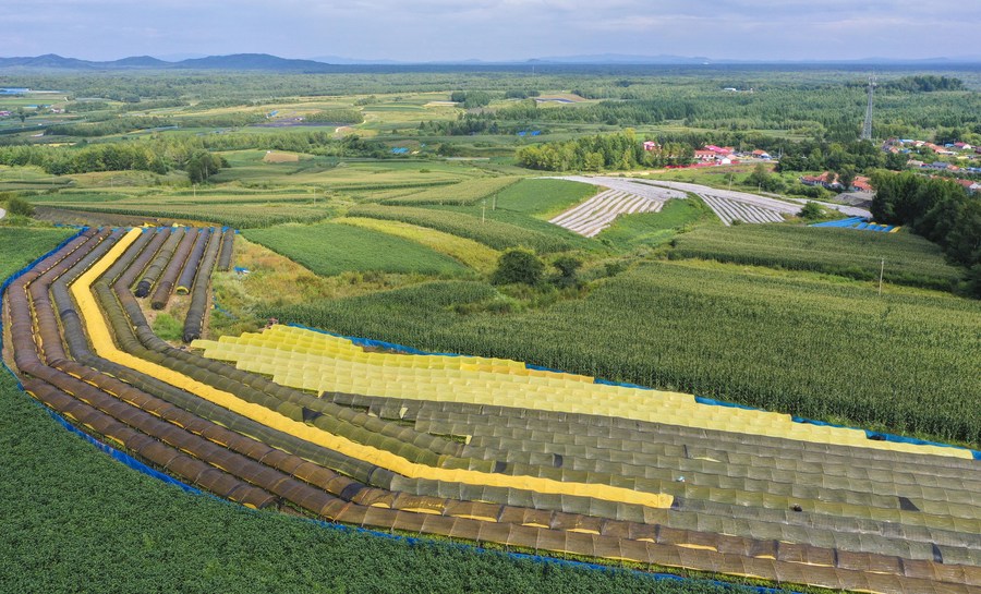 Aerial photo taken on Aug. 28, 2020 shows the ginseng greenhouses in Dafang Village in Wanliang Township of Fusong County, northeast China's Jilin Province. (Xinhua/Xu Chang)