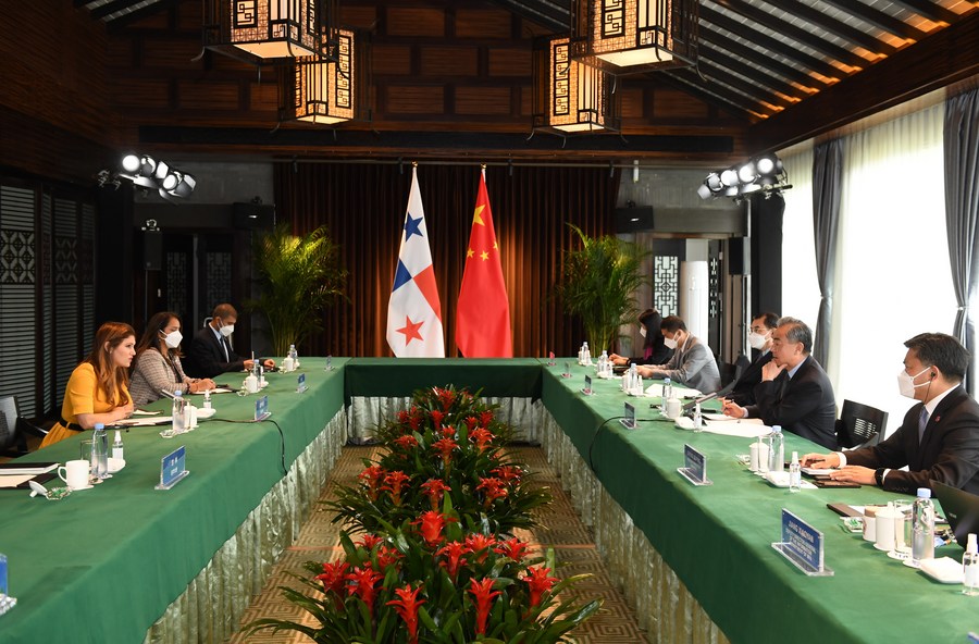 Chinese State Councilor and Foreign Minister Wang Yi holds talks with Panamanian Foreign Minister Erika Mouynes in Tunxi, east China's Anhui Province, April 4, 2022. (Xinhua/Zhou Mu)
