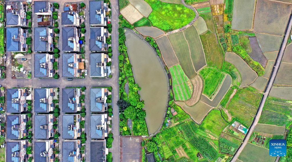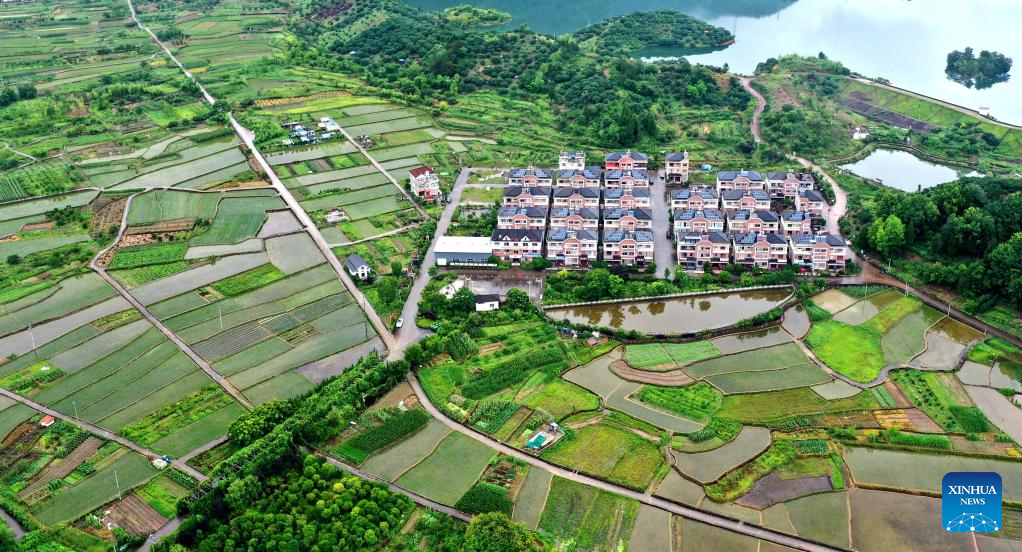 Aerial photo taken on June 13, 2022 shows the view of Xinlian village in Xianju County, east China's Zhejiang Province. Xinlian village, an immigrant village of Dongling Reservoir, is planned, designed and built in a unified style. (Photo by Wang Huabin/Xinhua)