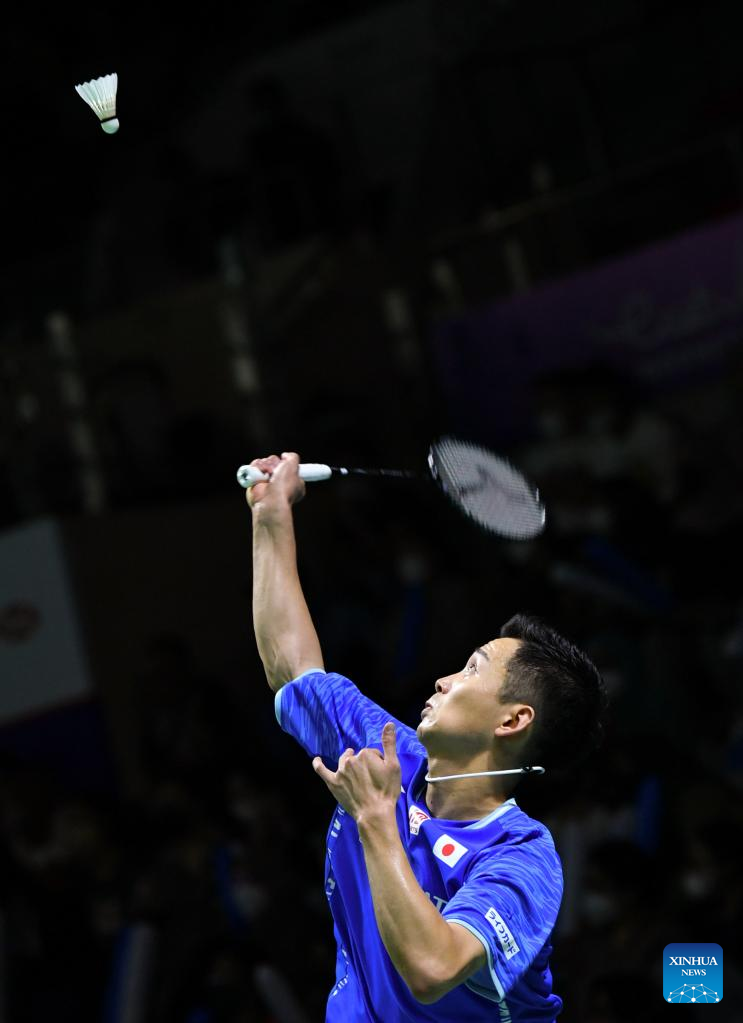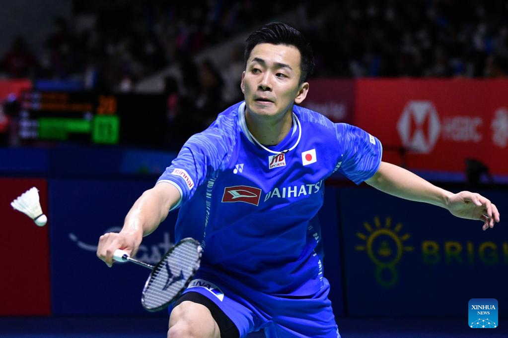 Japan's Nishimoto Kenta hits a return during the men's singles round of 32 match against China's Lu Guangzu at Indonesia Open 2022 at the Istora Senayan sports stadium in Jakarta, Indonesia, June 14, 2022. (Xinhua/Xu Qin)