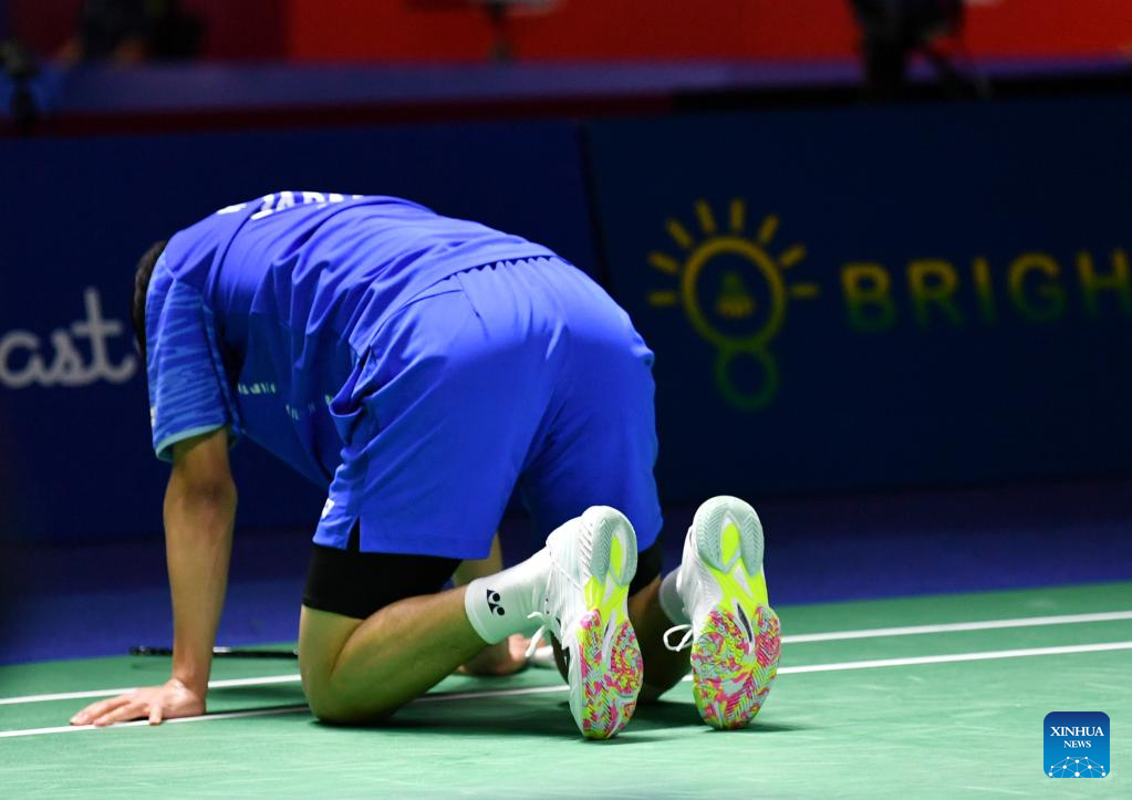 Japan's Nishimoto Kenta kneels on the ground during the men's singles round of 32 match against China's Lu Guangzu at Indonesia Open 2022 at the Istora Senayan sports stadium in Jakarta, Indonesia, June 14, 2022. (Xinhua/Xu Qin)