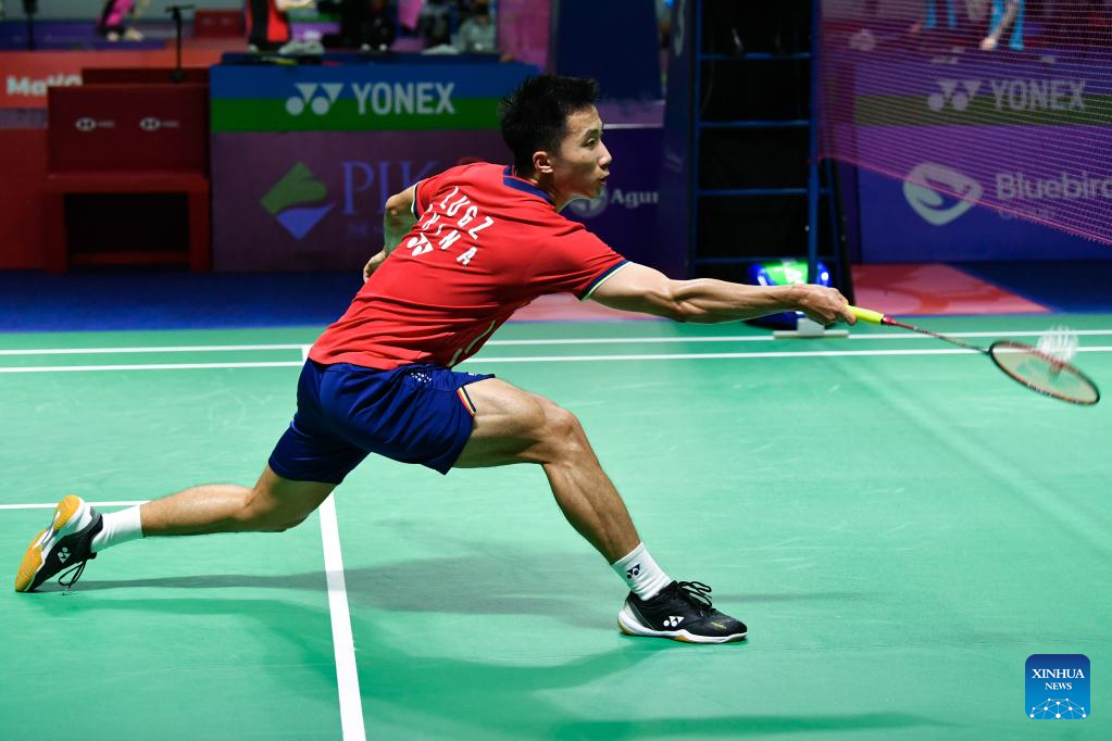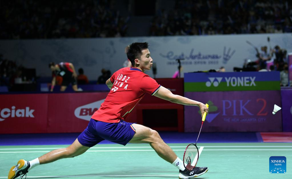 China's Lu Guangzu hits a return during the men's singles round of 32 match against Japan's Nishimoto Kenta at Indonesia Open 2022 at the Istora Senayan sports stadium in Jakarta, Indonesia, June 14, 2022. (Xinhua/Xu Qin)