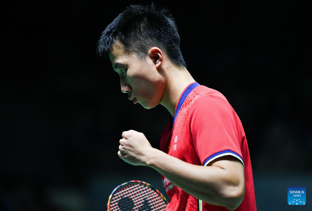 China's Lu Guangzu reacts during the men's singles round of 32 match against Japan's Nishimoto Kenta at Indonesia Open 2022 at the Istora Senayan sports stadium in Jakarta, Indonesia, June 14, 2022. (Xinhua/Xu Qin)