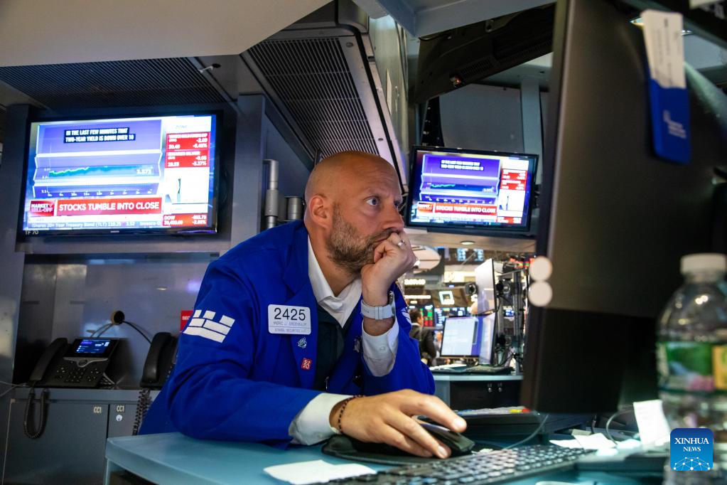 A trader works at the New York Stock Exchange (NYSE) in New York, the United States, June 13, 2022. U.S. stocks fell sharply on Monday as investors continued to dump risky assets amid surging inflation.
